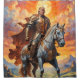 A valiant Trump clad in resplendent golden armour rides a majestic white horse against a breathtaking backdrop of a vibrant, sunlit sky. The knight's flowing red cape and the horse's powerful stance evoke a sense of heroism and grandeur. The dramatic clouds and the radiant sun create a striking contrast, enhancing the epic and timeless feel of the scene. This image captures the essence of mediaeval chivalry and adventure, making it a captivating visual for enthusiasts of fantasy and historical themes.