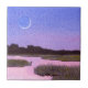 A watercolor painting of a Great Blue Heron hunting in a wetland marsh under a crescent moon adorns this decorative tile!