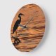 This fine art wall clock presents a Great Blue Heron (ardea herodias) in silhouette, fishing in the shallow waters of Cayuga Lake in Ithaca, NY which is one of the Finger Lakes of upstate New York. A beautiful orange, yellow and gold sunset colours the waves and ripples in an abstract pattern.
