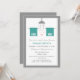 Cute lesbian couple's shower invitation in teal, grey, and pink with his and his towels and a shower head sprinkling water and hearts.