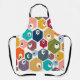 This apron has mid-century modern design of hexagons in many colors with black and white circles inside them.