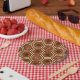Traditional Japanese kimono print paper plates - nesting hexagons with a central flower motif in light beige, rust brown and tan on a dark chocolate brown background