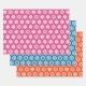 Wrapping paper in a Japanese kimono print PH - nesting hexagons with a central flower motif in deep burgundy wine, fuchsia pink and white on a pastel pink background, dark navy / indigo blue, white, and medium denim blue on a light sky blue background, and deep Mandarin orange, pastel orange and cream on a soft orange background