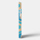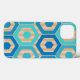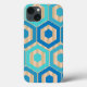 This phone case has a geometric design of hexagons in four shades of blue on a field of tan stripes in two shades.