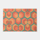 This doormat has a geometric design of hexagons in sets of three that look like flowers in gold, orange, and red on a field of teal.