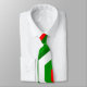 This tie has a Christmas geometric design of hexagons in sets of three that look like flowers in red, white, and green.