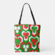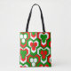 This tote bag has a Christmas geometric design of hexagons in sets of three that look like flowers in red, white, and green.