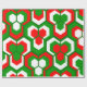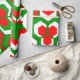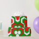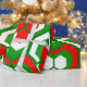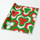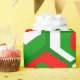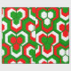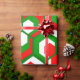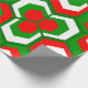 This wrapping paper has a Christmas geometric design of hexagons in sets of three that look like flowers in red, white, and green.
