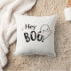 Modern and cute "Hey Boo" Halloween home decor pillow design features text in black, pink and white colours with a cute little ghost accent.