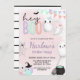 A not so spooky halloween party! Pastel pink, purple, green and peach watercolor Hey Boo Ghost Halloween Birthday invitation with black and white stripe background.