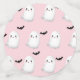 A not so spooky halloween party! Pastel pink Hey Boo Ghost Halloween Birthday Party Decor table Confetti with black and white stripe background.