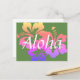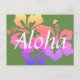 Rainbow hibiscus flowers on green background with "Aloha" text overlay
