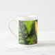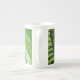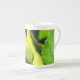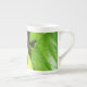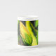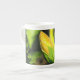 The bright yellow flower bud, in the original photograph by MaeFlowers on this Bone China Mug, gives us a hint of the orange colour the flower will become. The bright sunlight highlights the details of the bud in this closeup photo. A yellow green leaf of the Orange Hibiscus bush peeks in from the right. Its edge is curved with a zigzag finish. Part of a fern frond lines the left edge, and the background is made up of soft focus natural greens, yellows and browns.