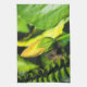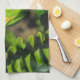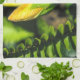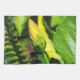 This bright yellow flower bud, in the original photograph by MaeFlowers on this Kitchen Towel, gives us a hint of the orange colour the flower will become. The bright sunlight highlights the details of the bud in this closeup photo. A yellow green leaf of the Orange Hibiscus bush peeks in from the right. Its edge is curved with a zigzag finish. Part of a fern frond lines the left edge, and the background is made up of soft focus natural greens, yellows and browns.