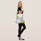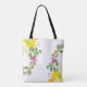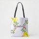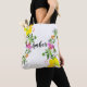 White hibiscus tote with yellow, purple, pink and orange flowers on a green swirly vine. Add your name and make it yours!