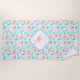 A pretty aqua teal and pink flamingo and hibiscus flower pattern is the background on this tropical themed beach towel. At the centre is an ornate white banner with an image of a single pink flamingo.