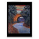 Painting of a landscape with a bridge and blue trees.