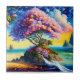 A beautiful digital painting of a lush green island in the middle of the ocean. The island is covered in lush trees and flowers, and the water is a clear blue. A small boat is anchored in the bay, and a few people are relaxing on the beach. This painting is perfect for anyone who wants to escape to a tropical paradise.