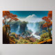 Oil landscape painting in the style of Roger Dean of a cliff lined valley with many waterfalls in a far off jungle.