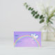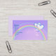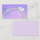 A business card with a pretty image of two silver and blue hearts and a rainbow.