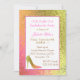Pretty pink and gold foil looking bachelorette party invitation. A white text area, in the middle, is edged with a pink frame and graphics of a foil looking gold and pink high heel decorates the bottom left corner. Text in pink and golden brown is fully customisable for your event. Lovely invitation the bride to be will cherish her life time. Matching envelopes available.