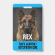 A blue background and solid all-caps fonts add importance and ease of readability to this detection dog name and photo ID badge. Personalise with animal's name, handler name and address, plus badge #. Font type and font colours can be modified as desired.