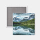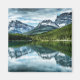 This photo features reflection off a lake in Alberta, Canada in the shadow of the snow capped Canadian Rockies.