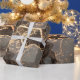 High resolution. Luxury abstract fluid art painting in alcohol ink technique, mixture of black, gray and gold paints. Imitation of marble stone cut, glowing golden veins. Tender and dreamy design.