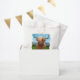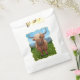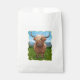 Cute Animal Parade Highland Cow Party Favour bags are perfect for your animal loving kid for his or her animal themed Highland Cow birthday party. Our animal artwork features an adorable hairy brown and tan cow with a mop of blonde hair covering one eye and huge curving horns rising up into a splatter painted blue sky. She is standing in a highland field of green with white flowers and snow topped mountains in the background. This fun hairy cow, or as the locals call them, Hairy Coos is sure to bring smiles!
