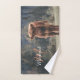 Highland cow calf autumn grass field photograph. Stunning young calf of highland scottish cattle on an autumn grassy field with muted colours. Beautiful dark hairy orange coat contrasting with light yellow green grass and trees in bokeh in background. Custom personalizable monogram with your name and inital on the left.