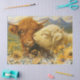 Highland cows in a field of sunflowers with a mountainous vista in the background. From an original photograph by artist, Jennifer Carroll