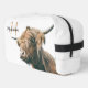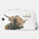 Highland cow portrait custom name initial monogram. Portrait photograph of a majestic orange brown highland cattle on a foggy day with white background.