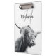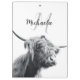 Highland cow portrait custom name initial monogram in black and white. Portrait photograph of a majestic highland cattle on a foggy day with white background in black and white.