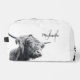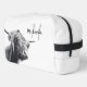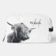 Highland cow portrait custom name initial monogram in black and white. Portrait photograph of a majestic highland cattle on a foggy day with white background in black and white.