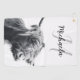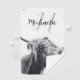 Highland cow portrait custom name initial monogram in black and white. Portrait photograph of a majestic highland cattle on a foggy day with white background in black and white.