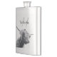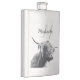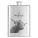 Highland cow portrait custom name initial monogram in black and white. Portrait photograph of a majestic highland cattle on a foggy day with white background in black and white.
