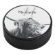 Highland cow portrait custom name initial monogram in black and white. Portrait photograph of a majestic highland cattle on a foggy day with white background in black and white.