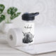 Highland cow portrait custom name initial monogram in black and white. Portrait photograph of a majestic highland cattle on a foggy day with white background in black and white.