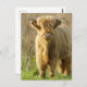 A young Highland cow with an unusual white head standing in the reed grass. These highland cattle are probably about 18 months old looking at those horns.