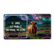 Beautiful Highland cow surrounded be luscious green Mountains and colourful nebulas in the sky.