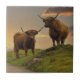 Highland cows standing on a hill at sunset. One of the cows sticking out his tongue.