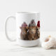 A trio of cute baby highland cows wearing knit caps. They are getting ready for the cold and you can too with this fun mug! Enjoy the holiday season with your favourite hot beverage in this mug.