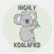Highly Koalafied - Highly Qualified. A cute grey Koala cartoon graphic drawing with a koala bear pun. Funny and sweet wild animal design. Australian wild baby animal on a eucalyptus tree with gum leaves