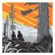 Illustration of hikers sitting on log in Boy Scout Tree Trail in Jedediah Smith Redwoods State Park east of Crescent City in California done in retro woodcut WPA style.