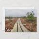 Panoramic view of bog with wooden path, small ponds and pine trees. Hiking trail with wooden walkway that goes across the swamp...