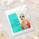 An outrageously funny and unique birthday party favour bag for a fabulous woman celebrating her 50th Birthday, this design features a kitschy stylish woman in striped sunglasses and hair turban with a polka dot bag and striped towel, rocking her attitude. The humour is carried out in the bold text title "FIFTY IS THE NEW F-BOMB". Personalise the name with the fabulous Birthday Girl. The retro colour scheme of aqua, beige, navy and red adds to the fun of this design.