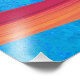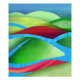 An abstract landscape with vibrant colours and textures showing hills floating on ice in shades of green, blue, cyan, red, and pink.