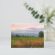 This postcard features a magical play of light and colour on a hilltop at sunset. It had been raining all day. The sky began to clear just as the sun was setting. The foreground begins with a hint of green, then a layer of golden weeds, and then a field of ripening corn ending in a hedgerow of trees. Distant hills in the mist can be seen beyond the field. The partly cloudy sky creates a glorious pattern of pink, gold, yellow, orange, mauve, blue and white.