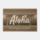 Brown colorway. The message of Aloha welcomes your visitors to your own tropical paradise. Swaying palms trees play against a background of graphic stripes in this print reminiscent of the designs used in vintage Hawaiian aloha shirts and board shorts. This design comes in several colorways. You can customise the message.