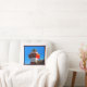 This pillow is white, and the lighthouse image has a darl b;ie amd red border.
